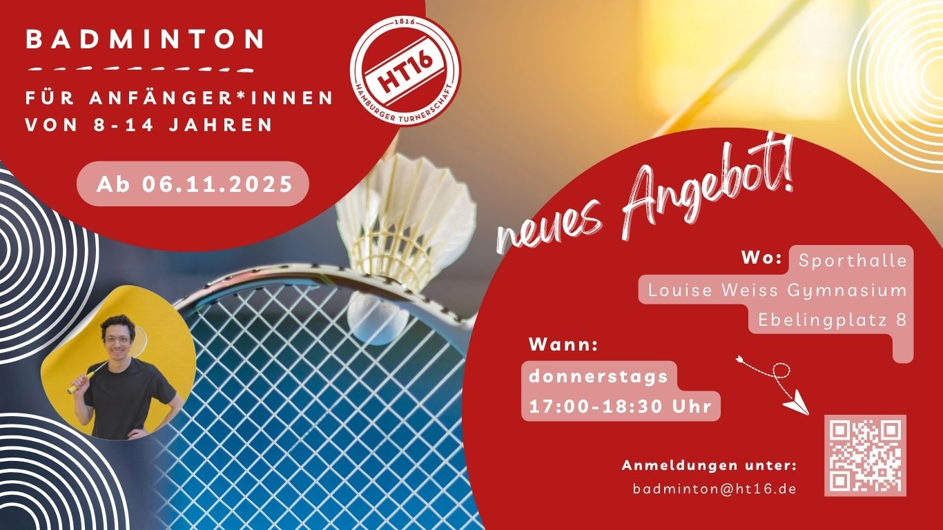 Ab dem 6. November 2025 startet unser Badminton-Angebot für Anfänger*innen von 8 bis 14 Jahren.