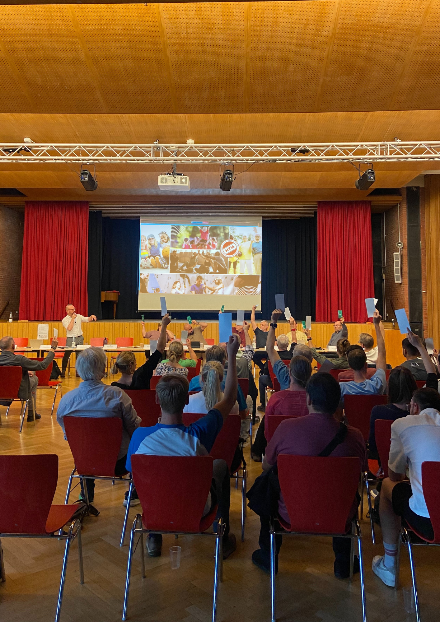 Heute, am 18.06.25, fand unsere diesjährige Delegiertenversammlung statt. In der Aula nebenan kamen wir zusammen, um gemeinsam über aktuelle Entwicklungen im Verein zu sprechen, sportliche Erfolge zu erwähnen, wirtschaftliche Berichte abzusegnen und ganz besondere Ehrungen auszusprechen. Schön, dass ihr so zahlreich erschienen seid – ein eindeutiges Zeichen dafür, wie sehr uns allen die HT16 am Herzen liegt. Der Austausch mit euch ist uns immer wieder eine große Freude!