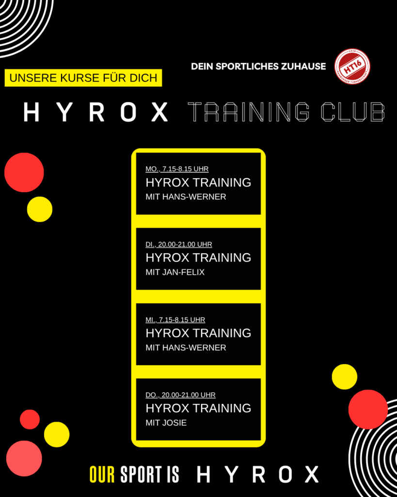 Die HT16 ist jetzt Teil des offiziellen HYROX-Netzwerks. Ganze viermal pro Woche kannst du HYROX bei uns trainieren – ergänzt durch ein breites Angebot im Functional Training. Beide Formate sind funktionelle Workouts, setzen aber unterschiedliche Schwerpunkte und richten sich an alle, die ganzheitlich fitter werden wollen.