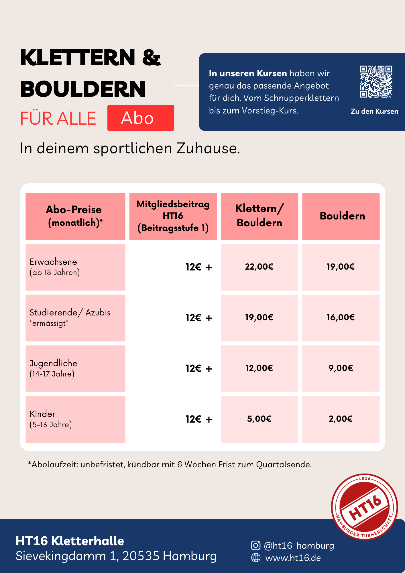 Wer mindestens eine Vereinsmitgliedschaft der Beitragsstufe 1 (12,00€ mtl.) erwirbt, spart bei den Kursgebühren und den Kletter-Abonnements.