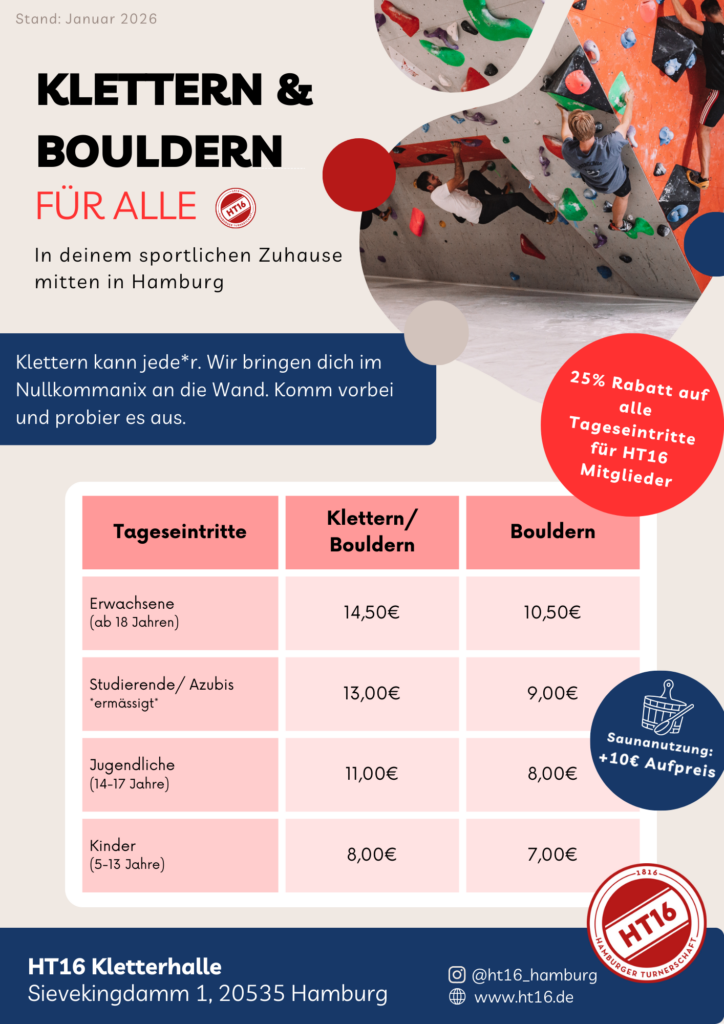Nachstehend findest du unsere Preise in der Kletter- und Boulderhalle.