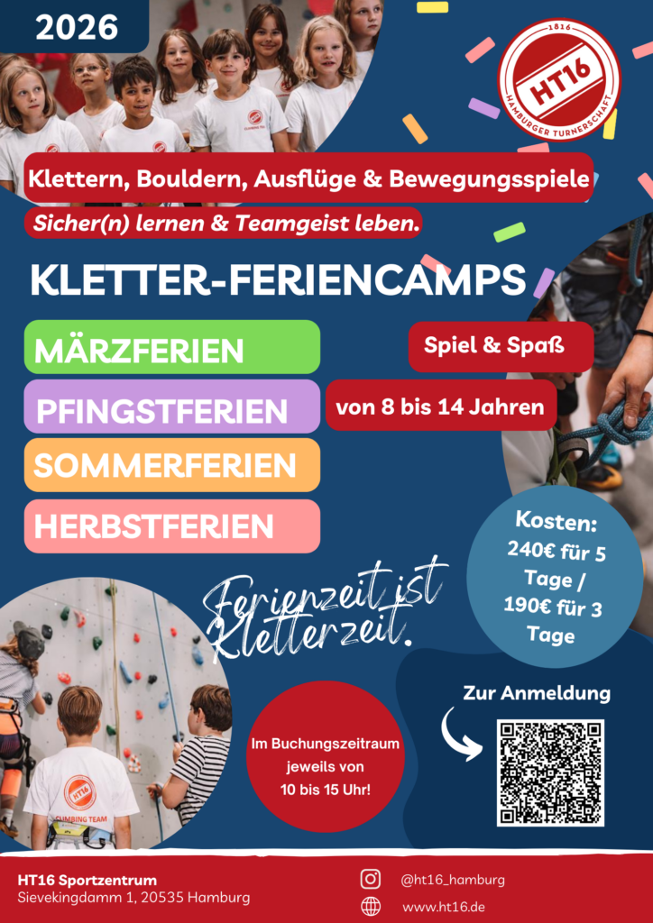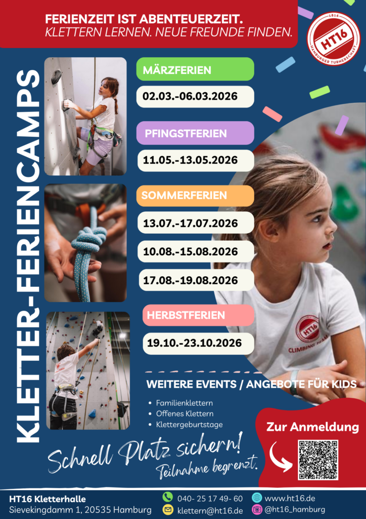 Bereit für aktive Ferien voller Spaß und Abenteuer? Dann sichert euren Kids schnell einen Platz in einem unserer HT16 Kletter-Feriencamps. Kinder und Jugendliche im Alter von 8 bis 14 Jahren erwarten ein abwechslungsreiches Programm aus spielerischem Klettern und Bouldern, viel Bewegung und gemeinsamen Erlebnissen.
