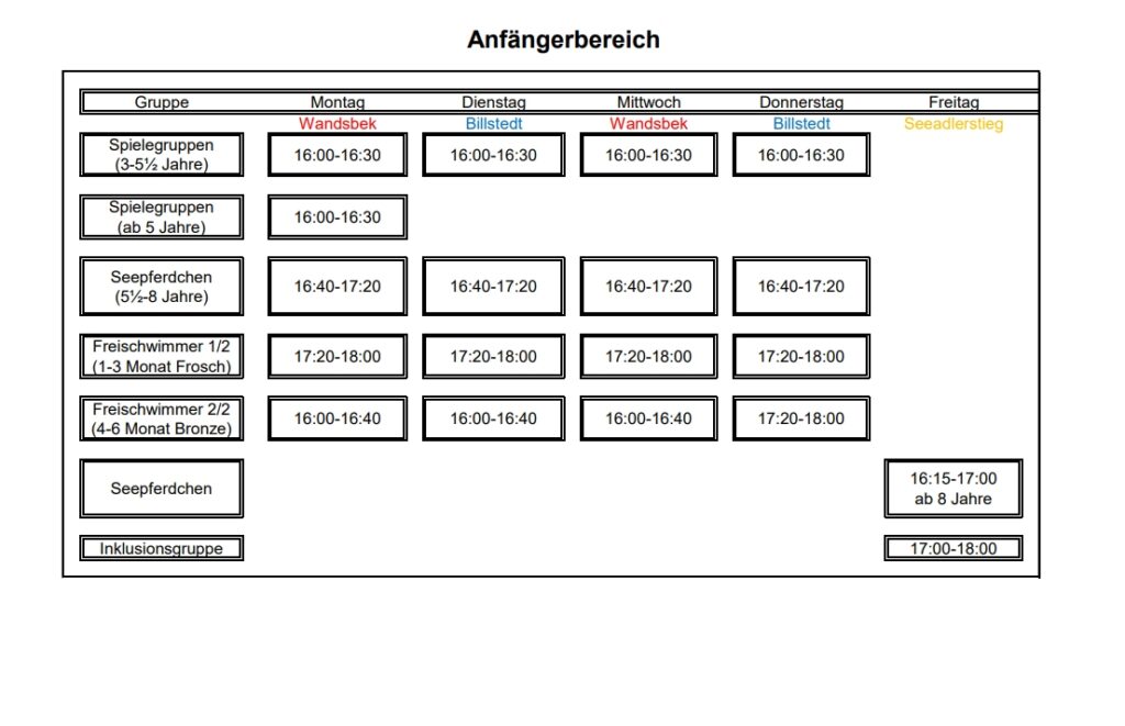 Alle untenstehenden Angebote finden 1xWoche statt und in der Bezirksschwimmhalle in Billstedt, Archenholzstr. 50a.