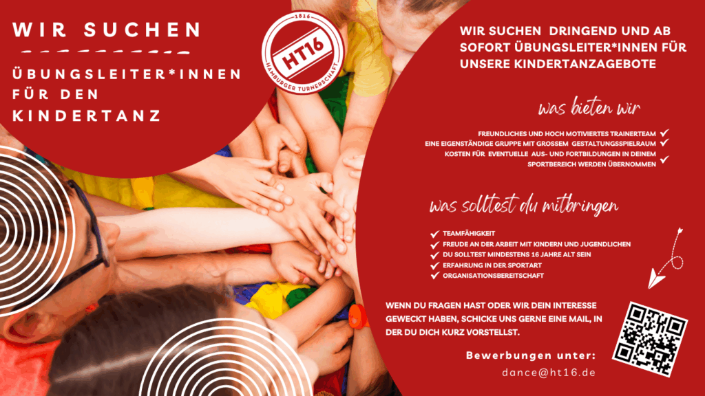 - Anforderungen: Erfahrung im Bereich Kindertanz und/oder eine entsprechende Ausbildung. Begeisterung für die Arbeit mit Kindern.