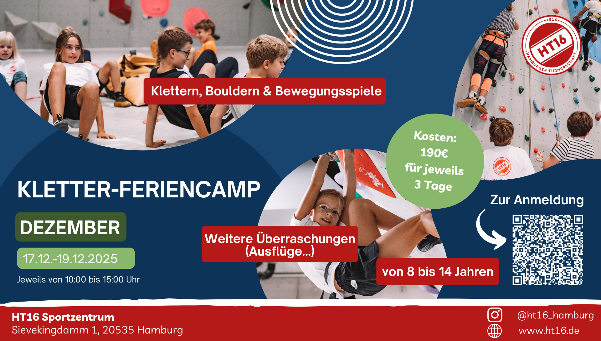 Noch mal hoch hinaus am Ende des Jahres? Sichert euch schnell einen Platz im Kletterferiencamp für Kids von 8-14 Jahren vom 17.-19.12.2025. Spiel, Spaß und Abenteuer garantiert!
